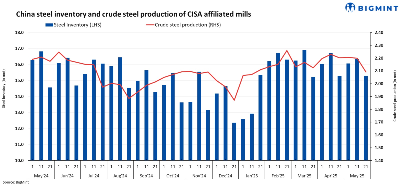 The average daily crude steel output of CISA-affiliated mills stood at 2.09 mnt in late-May, inching down 4.9% against 2.19 mnt in mid-May. Moreover, the same edged down by 5 % m-o-m against 2.20 mnt in late-April.