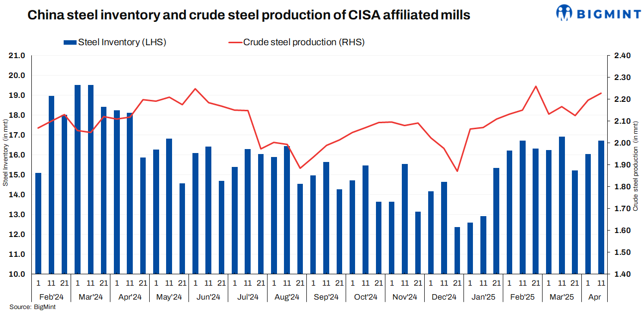 The average daily crude steel output of CISA-affiliated mills touched 2.229 mnt in mid-April, an increase of 1.5% compared to 2.197 mnt in early-April. Furthermore, it rose by 5.2% y-o-y from 2.12 in mid-April 2024.