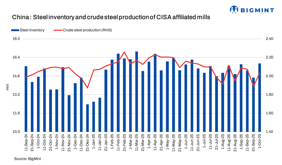 According to the latest data from the China Iron and Steel Association (CISA), total steel inventories at key member mills stood at 15.88 million tonnes (mnt) in early October 2025, marking an increase of 1.21 mnt or 8.2% compared with 14.67 mnt in late September. On a month-on-month (m-o-m) basis, inventories were up by 0.06 mnt or 0.6%, and by 1.15 mnt or 7.8% year-on-year (Y-o-y), indicating continued accumulation amid sluggish demand recovery.
