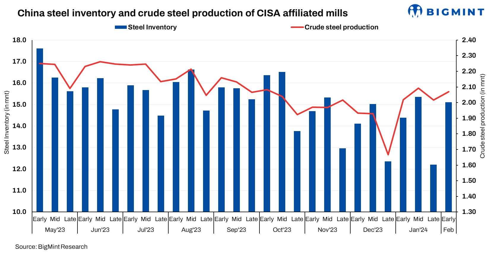 The China Iron and Steel Association (CISA) reported steel inventory of key enterprises in early-February 2024 at 15.100 million tonnes (mnt), an increase of 2.901 mnt or 23.78% compared to 12.199 mnt in late-January. Moreover, inventories rose by 705,700 t or 4.9% m-o-m compared with 14.394 mnt in early-January 2024. In addition, inventories fell by 16.25% y-o-y or 2.92 mnt compared to 18.020 mnt in early-February 2023.