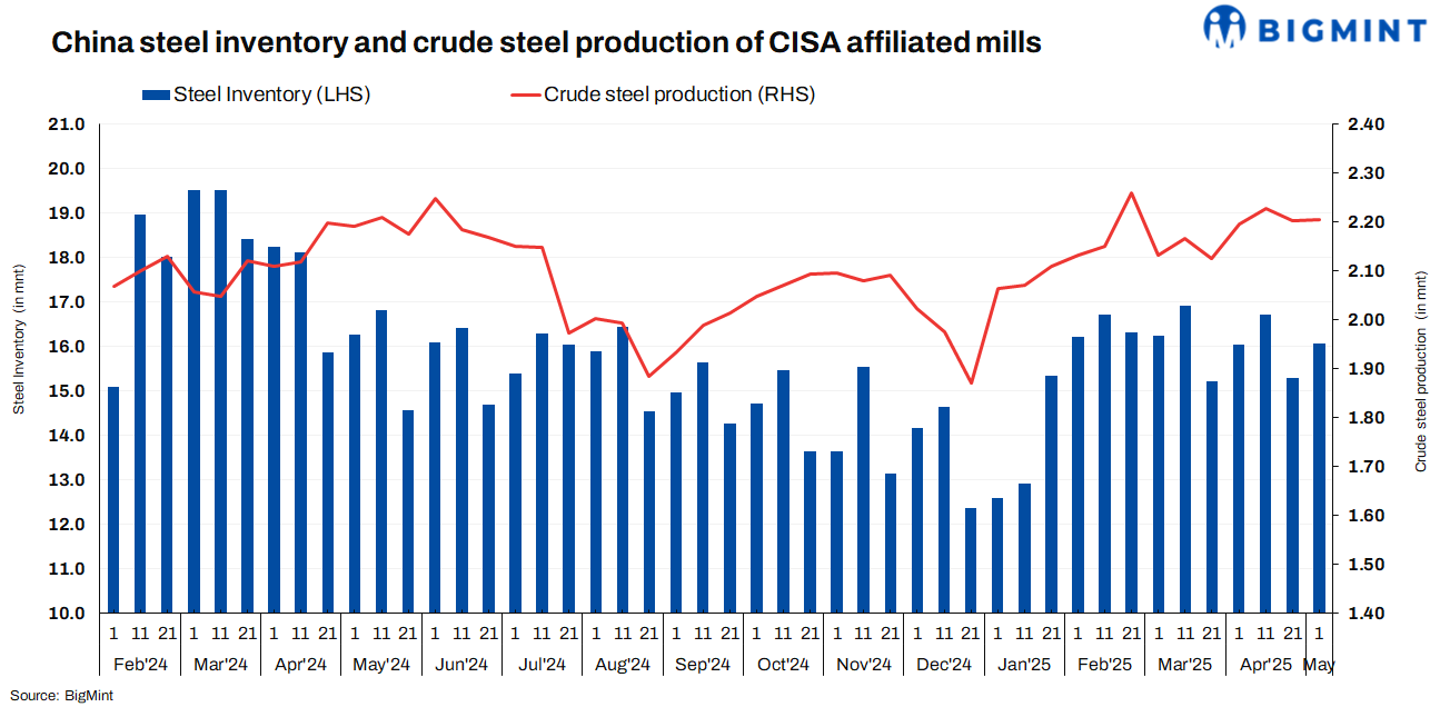 The China Iron and Steel Association (CISA) has announced that the total steel inventory at key Chinese enterprises stood at 16.06 million tonnes (mnt) in early-May 2025. Inventory levels increased by 770,000 tonnes (t) or 5% from 15.29 mnt in late-April 2025. Moreover, the inventory inched up by 20,000 t or 0.1% m-o-m from 16.04 mnt in early-April. However, on a y-o-y basis, steel inventories declined by 220,000 t or 1.4% compared to 16.27 mnt in early-May 2024.