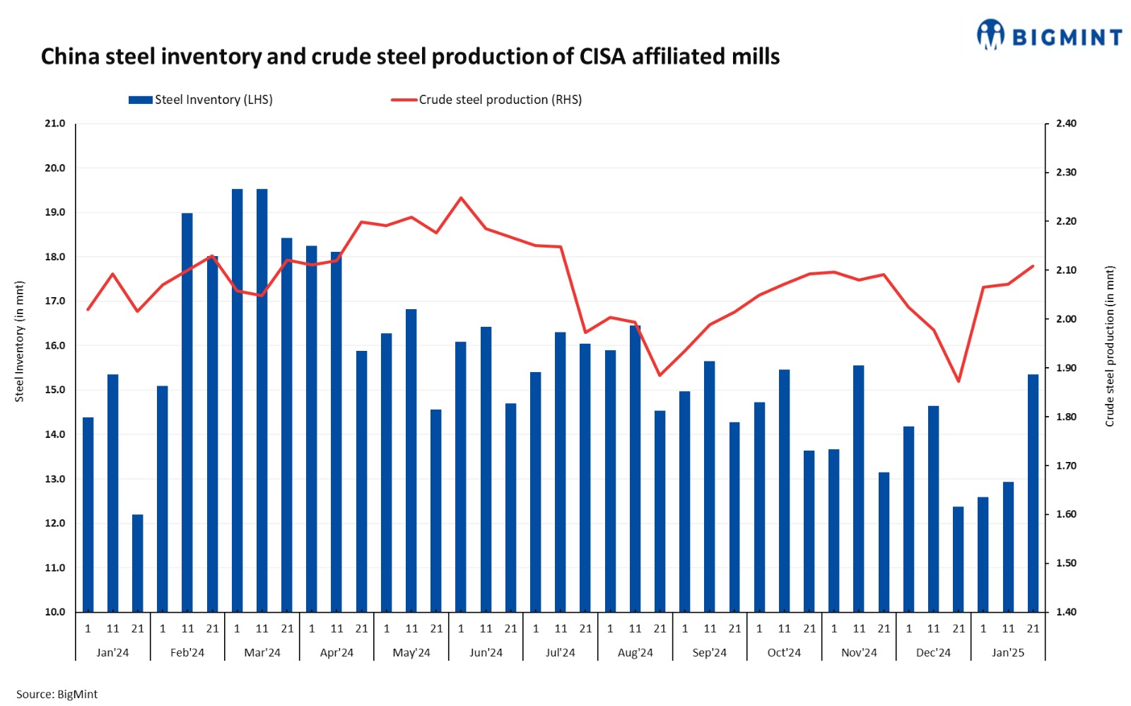 The China Iron and Steel Association (CISA) reported that the total steel inventory at key Chinese enterprises stood at 15.35 million tonnes (mnt) in late-January 2025. Inventory levels increased by 2.42 mnt or 18.7% against 12.93 mnt in mid-January 2025. Moreover, the same rose by 2.98 mnt or 24.1% m-o-m from 12.37 mnt in late-December 2024. Furthermore, compared to 12.199 mnt in late-January 2024, inventory levels rose by 3.15 mnt or 25.8% y-o-y.