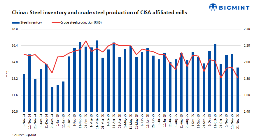The average daily crude steel output of CISA-affiliated enterprises reached 1.818 mnt in late-November, declining by 6.4% from 1.943 mnt in mid-November. Furthermore, output declined by 13.1% y-o-y against 2.09 mnt in late-November 2024.