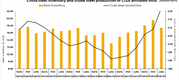 Steel inventory at China Iron and Steel Industry Association-(CISA) affiliated mills dropped in late-February 2023. However, crude steel production increased significantly in the same period.