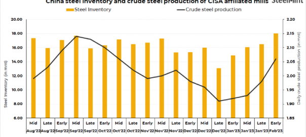 China’s steel inventory and average daily crude steel production of CISA (China Iron and Steel Industry Association) affiliated mills in early-February 2023 rose with an expectation of balanced supply and demand due to the steady recovery of the Chinese economy.