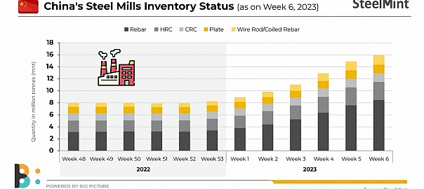 - Steel inventory with Chinese mills rose by 7% w-o-w to 15.92 mnt as on 10 Feb’23 against 14.89 mnt a week ago.
