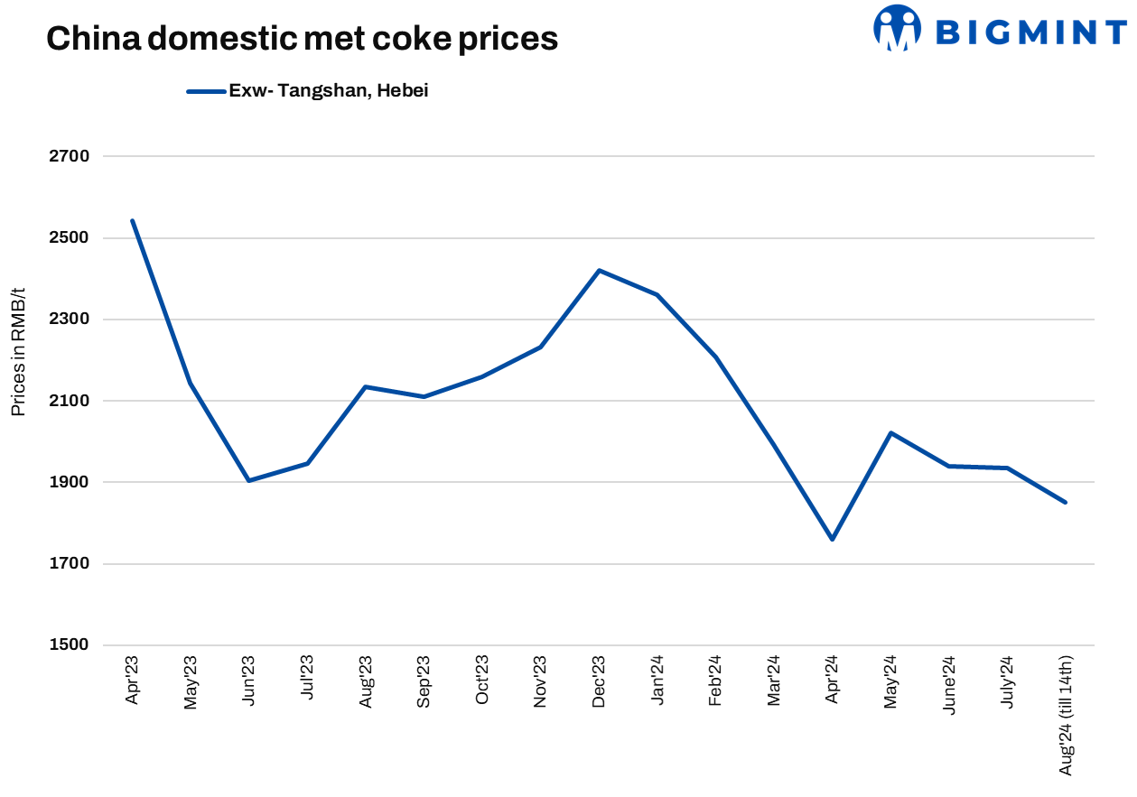 Some Chinese mills in the Hebei region, particularly the Xingtai and Tianjin area, have proposed a price reduction of RMB 50-55/t ($6.99-7.69/t) effective from 15 Aug’24. The price for wet quenched met coke will be reduced by RMB 50/t, and dry quenched met coke by RMB 55/t. The third round of price cut had landed on 12 Aug.