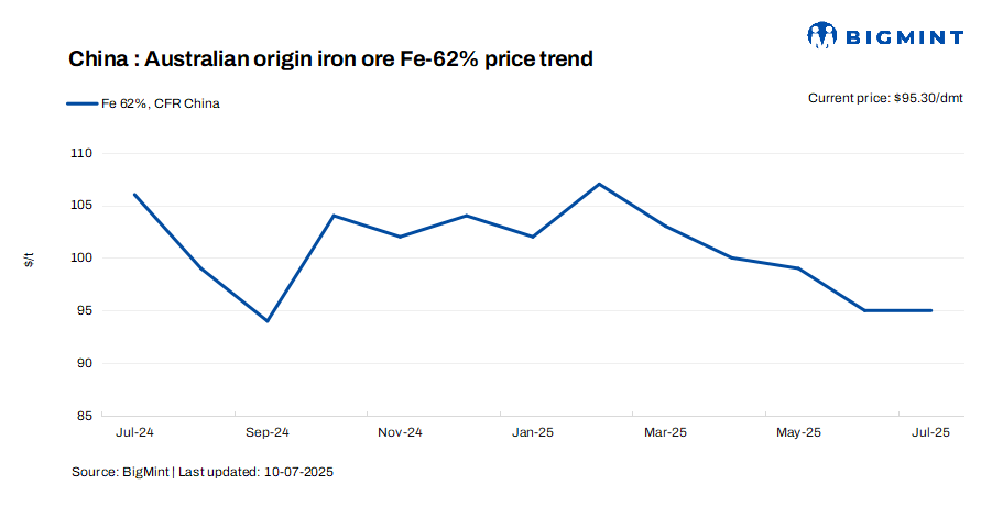 Last month, imported iron ore prices generally declined from May, with the Mysteel SEADEX 62% Australian Fines index falling by $3.2/dmt throughout the month to $93.55/dmt CFR Qingdao on 30 June. Just days earlier, on 25 June, the index had touched an intra-year low of $91.9/dmt before rallying later, Mysteel’s assessment showed.