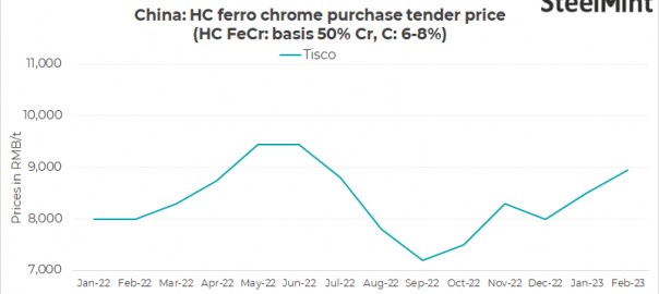 China’s stainless steel major Taiyuan Iron and Steel Corporation (TISCO) has increased ferro chrome (HC 50%) purchase prices for Feb’23 by RMB 450/t ($67/t) m-o-m to to RMB 8,945/t ($1,324/t) DAP, including taxes. Stainless steel makers have returned to work after the holidays and operating rates are increasing, resulting in a steady release of demand. This has supported ferro chrome prices.