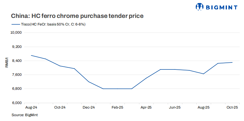 China’s Taiyuan Iron and Steel Corporation (TISCO) raised its Oct’25 ferro chrome tender price by RMB 50/t ($7/t) m-o-m to RMB 8,295/t ($1,162/t) DAP, inclusive of taxes. The increase is followed by Tsingshan’s higher Oct’25 tender prices and supported by stable raw material costs and firm downstream demand.