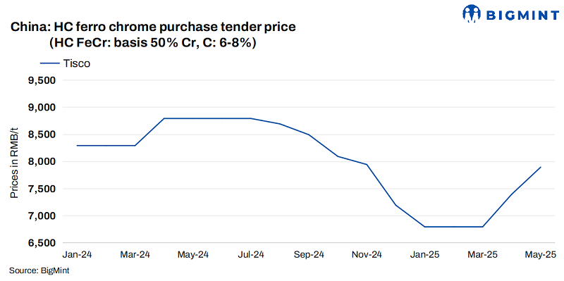 China: TISCO raises ferro chrome tender price by RMB 500/t ($69/t) for May’25