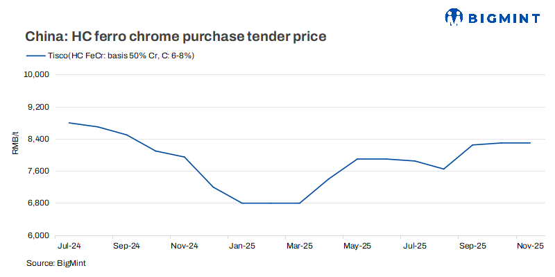 China’s Taiyuan Iron and Steel Corporation (TISCO) maintained its ferro chrome tender price unchanged m-o-m for Nov’25 at RMB 8,295/t ($1,164/t) DAP, inclusive of taxes. This was likely driven by stable domestic ferro chrome prices in Oct’25, supported by firm ore costs and steady downstream demand.