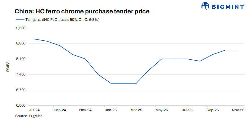 Tsingshan has kept its ferro chrome tender prices steady m-o-m at RMB 8,495/t ($1,193/t) DAP, inclusive of taxes, for Nov’25 deliveries. The price stability is likely driven by TISCO’s recent announcement of unchanged tender prices for Nov’25, along with firm domestic ferro chrome tags in Oct’25 and steady downstream demand.