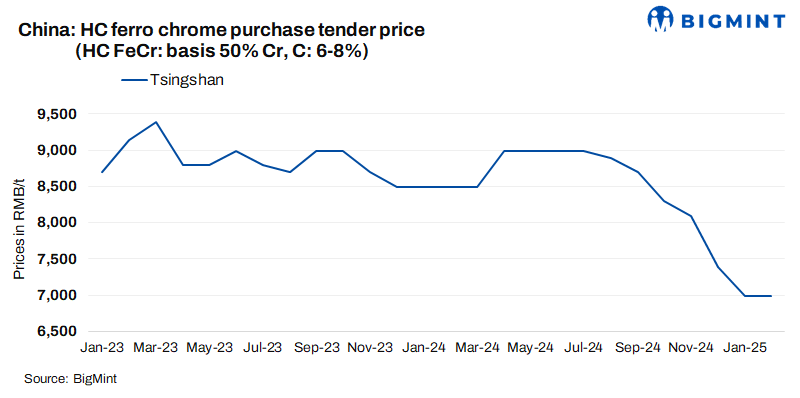 China’s Tsingshan has kept its ferro chrome tender prices stable m-o-m at RMB 6,995/t ($956/t) DAP, including taxes for Feb’25. The market remains under pressure from sufficient supplies and sluggish demand from stainless steel producers. However, sources suggest prices may have reached their lowest point and could rise post the Chinese New Year holidays.
