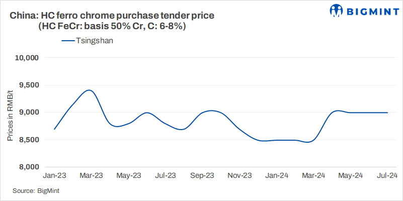 Tsingshan has kept its July’24 ferro chrome tender prices steady at RMB 8,995/t ($1,238/t), with delivery by 10 Aug’24. Domestic ferro chrome (Cr:50%) prices currently stand at RMB 8,975/t ($1,235/t) exw-Inner Mongolia. The stability in Tsingshan’s prices might be linked to consistent domestic spot prices and flat tender prices from TISCO.