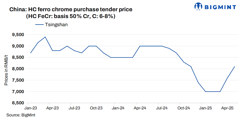 Tsingshan raised its ferro chrome tender price by RMB 500/t ($68/t) for May’25 deliveries, to RMB 8,095/t ($1,109/t) DAP, including taxes. The price increase was driven by higher costs of imported chrome ore and rising domestic tags and was further supported by improved steel demand due to the recent economic stimulus.