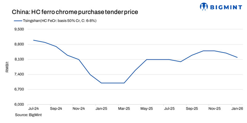 Tsingshan has lowered its ferro chrome tender price by RMB 200/t ($28/t) m-o-m to RMB 8,195/t ($1,166/t) DAP for Jan’26 deliveries. The reduction reflects the seasonal slowdown in stainless steel demand and weak downstream buying, while cautious procurement continued to weigh on prices despite ongoing cost-side support from raw materials.