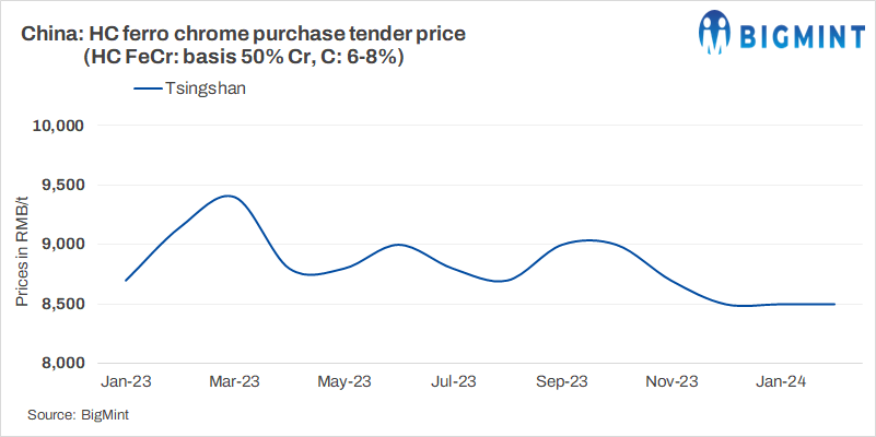China: Tsingshan’s ferro chrome tender prices remain unchanged for Feb’24