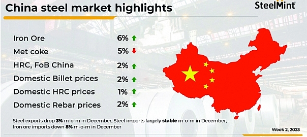3. China’s domestic billet prices rise w-o-w: Steel billet prices in China’s Tangshan rose sharply by $70/t w-o-w. Prices stood at RMB 3,850/t ($574/t), including 13% VAT, on 13 January. A hike in futures and finished steel prices over the week kept billet prices supported, SteelMint notes. According to data maintained with SteelMint, China’s SHFE rebar futures contract for May 2023 delivery closed at RMB 4,173/t ($622/t) on 13 January, an increase of RMB 66/t ($10/t) w-o-w.