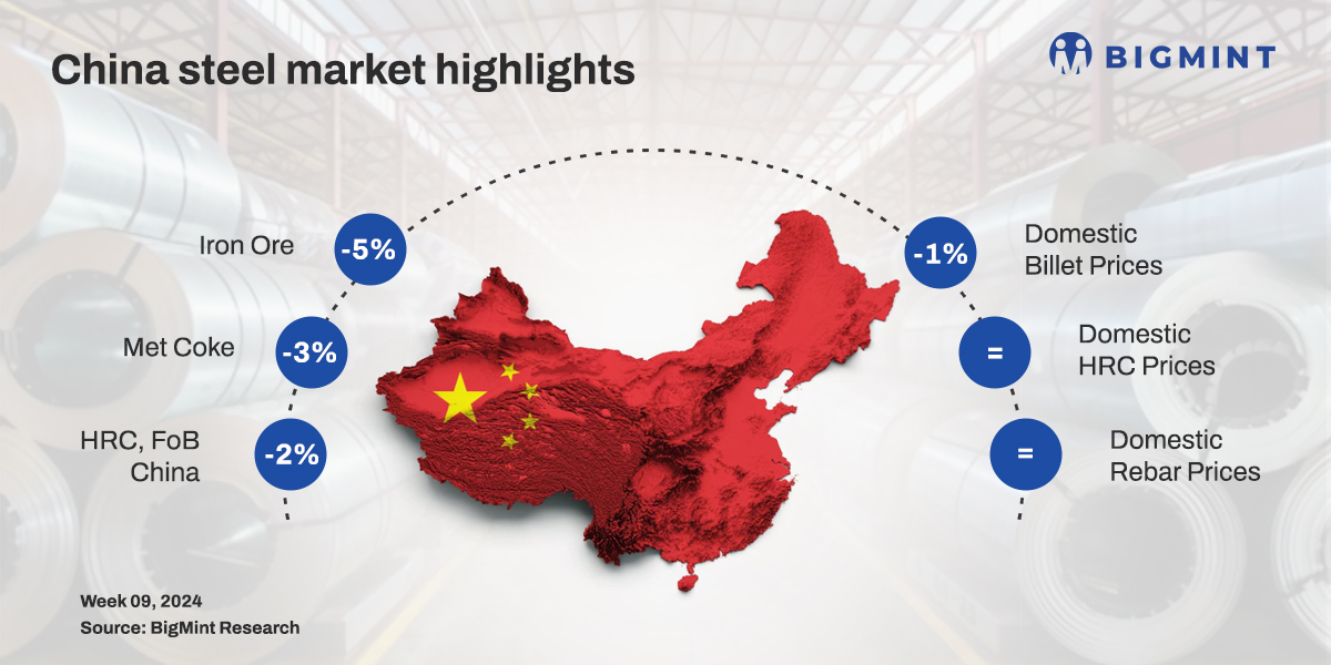 Chinese steel prices showed mixed trends this week amid subdued demand. Prices of HRC, rebar and coking coal remained stable w-o-w, whereas HRC export offers fell w-o-w. However, prices of iron ore and billet showed a downward trend this week.