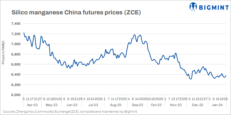 Silico manganese futures for Mar’24 deliveries on China’s Zhengzhou Commodity Exchange (ZCE) fell slightly by RMB 40/t ($6) w-o-w to RMB 6,378/t ($900/t) on 25 Jan’24. In the spot market, silico manganese (65-17) prices remained unchanged w-o-w at RMB 6,320/t ($889/t) exw-Inner Mongolia, as per BigMint assessment.