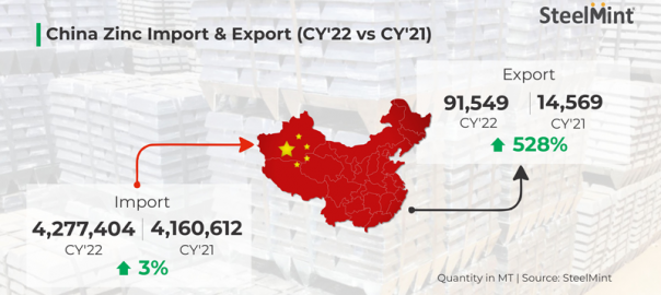 China’s imports of zinc were recorded at 4.27 million tonnes (mnt) in 2022 (CY’22) against 4.16 mnt, an increase of 3% y-o-y. Zinc export volumes from China stood at 91,549 t in CY’22, a increase of 528% compared to 14,569 t in 2021.