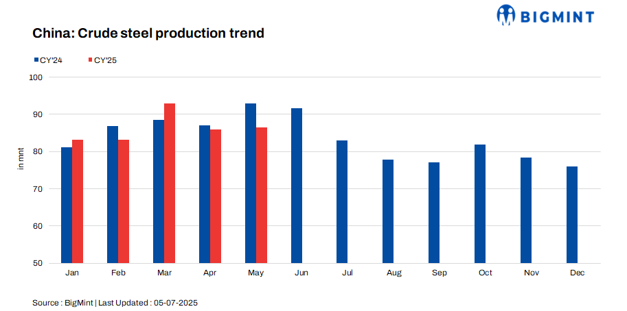 It may be recalled China’s crude steel production in May 2025 touched 86.55 million tonnes (mnt), an almost 7% y-o-y decline but a marginal 1% increase m-o-m compared to April 2025 while output over January-May, 2025 fell 1.7% y-o-y to 432 mnt.