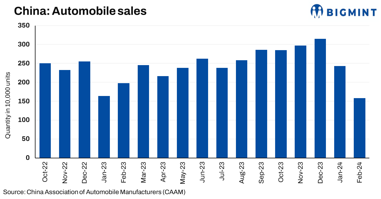 China’s automobiles sales in Feb’24 declined by 19.9% y-o-y to 1.584 million units as per data from the China Association of Automobile Manufacturers (CAAM). Moreover, sales saw decrease of 35.1% m-o-m against 2.439 million units in Jan’24, respectively. Meanwhile, auto production and sales for Jan-Feb’24, rose by 8.1% and 11.1% y-o-y to 3.919 and 4.026 million units.