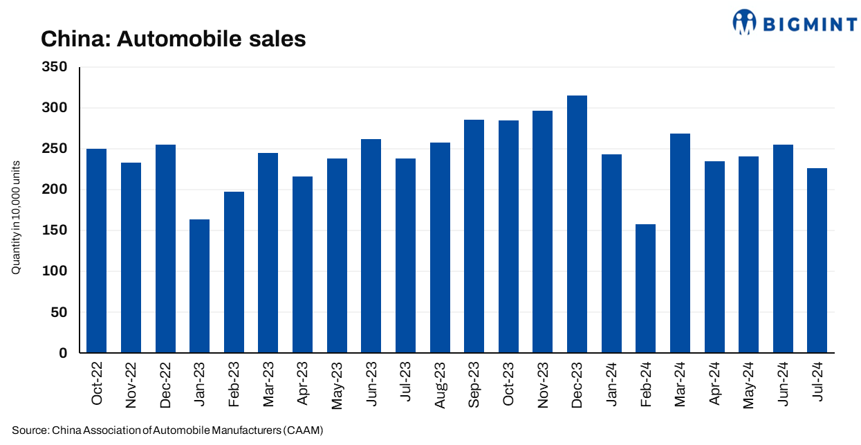 Chinese automobile sales in Jul’24 fell by 11.4% m-o-m to 2.262 million units as against 2.552 million units in Jun’24, as per data from the China Association of Automobile Manufacturers (CAAM). In addition, sales volumes saw a decline of 5.2% y-o-y. However, auto production and sales in Jan-Jul’24 increased by 3.4% and 4.4% y-o-y to 16.179 and 16.31 million units, respectively.