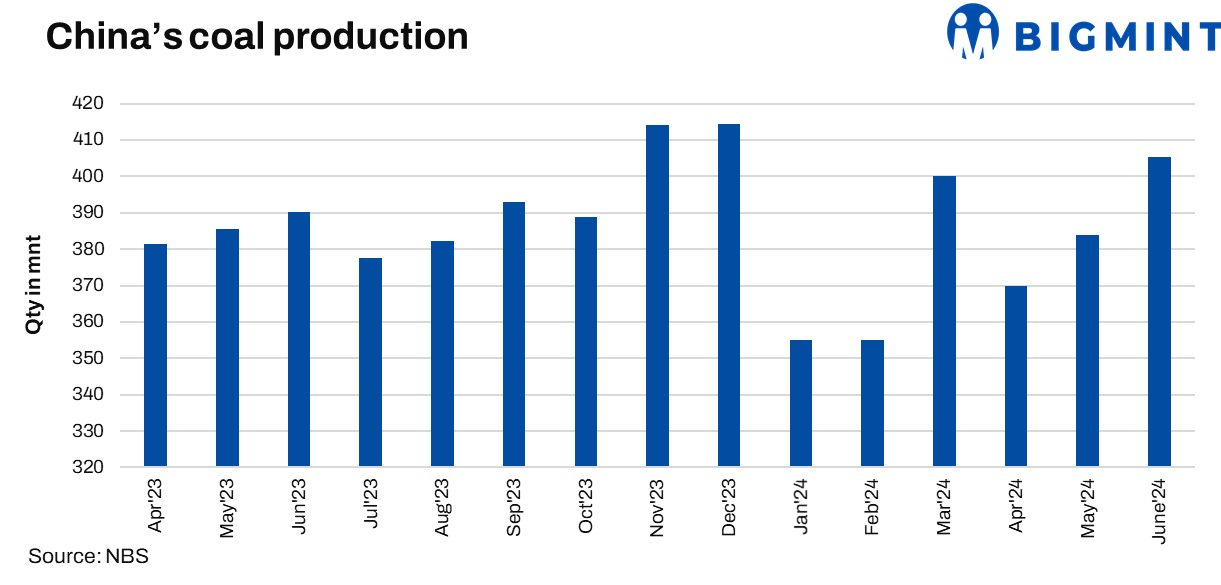 China’s total coal output in H1CY’24 was recorded at 2.27 bnt, down 1.7% y-o-y, due to increased safety inspections. Output was recorded at 405.38 mnt in Jun, an increase of about 4% y-o-y, according to latest data released by the National Bureau of Statistics (NBS). The daily raw coal production was at around 13.51 mnt in June, up about 9% from 12.38 mnt in May.