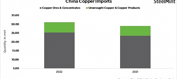 - The country’s imports of unwrought copper and other copper products in CY22 stood at 5.87 mnt, an increase of 6% compared to CPLY. In Dec’22, imports totalled to 0.51 mnt, a 5% m-o-m decline from 0.54 mnt in Nov’22.