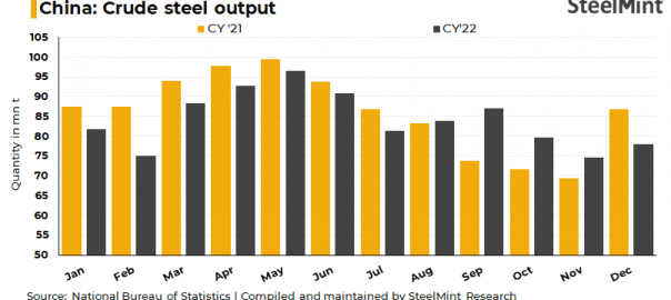 The country’s crude steel output in Dec’22 was recorded at 77.89 mnt, down 9.8% y-o-y. However, the volume rose by 4% m-o-m as compared to 74.54 mnt in Nov’22.