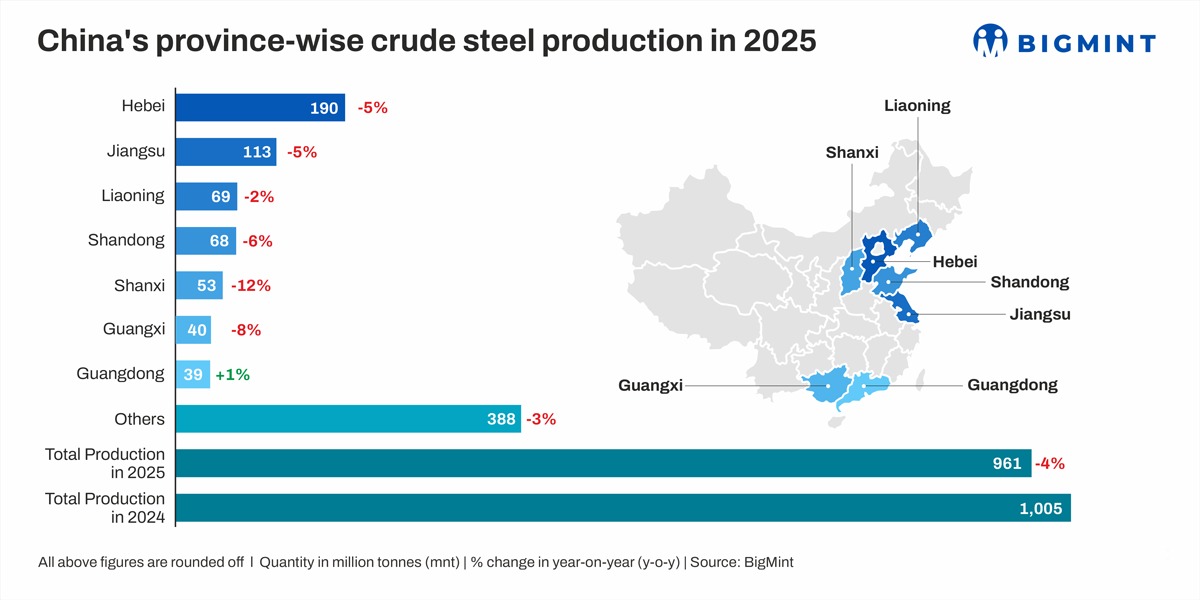 Full-year crude steel production in China in calendar year (CY) 2025 remained well below the 2020 peak, with annual output coming in at 961 million tonnes (mnt) level, nearly 10% lower than the record high of 1,065 mnt touched five years ago, and about 4.4% lower compared to CY2024. Industry and province-level data indicate that output continued to moderate amid capacity controls, weaker construction demand, and margin-driven production discipline.
