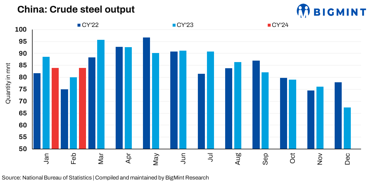 China’s crude steel output for the first two months of 2024 was 167.96 million tonnes (mnt), up by 1.6% y-o-y, according to the National Bureau of Statistics. This comes despite low-demand and maintenance work at steel mills.
