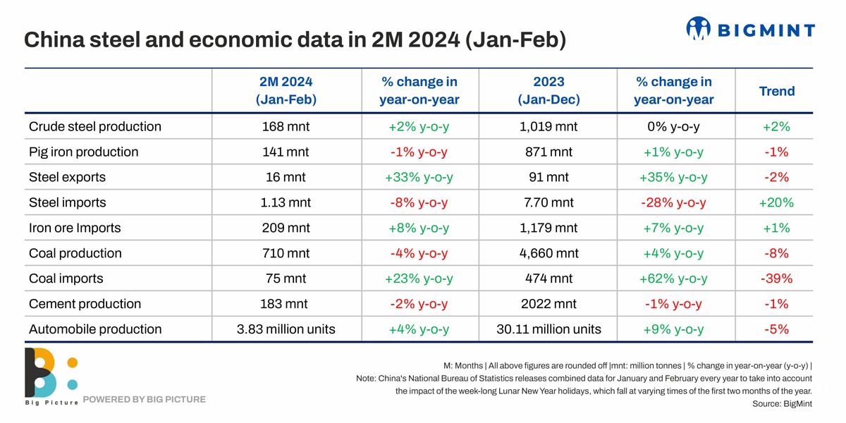 China, despite maintaining a flat crude steel production trend for the full year of 2023 at 1,019 million tonnes (mnt), has seen a slight uptrend yet again. NBS data maintained with BigMint shows that crude steel production rose 1.60% over January-February, 2024 to almost 168 mnt. This slight increase surprised markets as the expectation was the volume would fall especially against the backdrop of a still struggling real estate sector and falling domestic demand. The rise in output can be a function of a few factors. First is the sharp increase in steel exports over January-February, 2024. Secondly, the better performance of some of the downstream sectors. Manufacturing investment saw a significant 9.5% increase in February from 6.6% in December 2023, thanks to the government’s stimulus measures. Infrastructure investment also showed a 6.3% growth from 5.9% in December 2023.