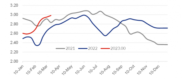 Mysteel’s other weekly survey showed that over March 10-16, capacity utilization among the 247 domestic BF steel mills under its regular tracking had continued its two-month climb to hit a five-month high of 88.44%, higher by another 0.41 percentage point from the prior week. Similarly, that for the 87 sampled EAF mills also increased to 66.17% during the same period, up 2.82 percentage points on week and refreshing the highest rate since mid-May 2022.