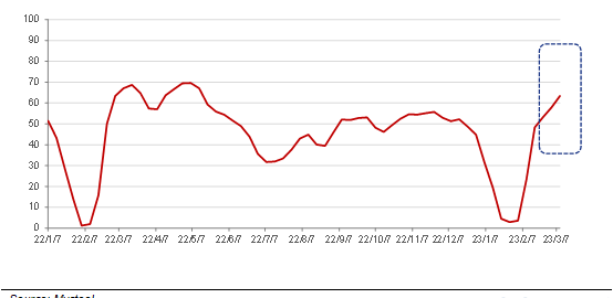 In tandem, the continuous recovery in the steelmakers’ margins resulted in a parallel increase in capacity usage among the domestic EAF producers. Over March 3-9, the capacity utilization rate among the 87 EAF mills nationwide which Mysteel regularly surveys rose for the sixth straight week by another 5.41 percentage points on week to 63.35% as of March 9, a new high since mid-May 2022.
