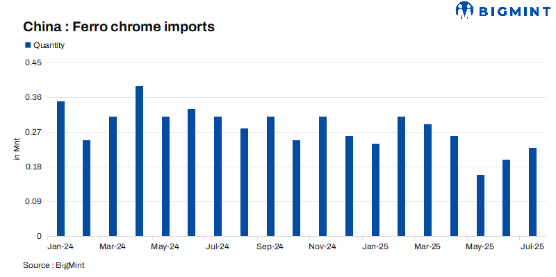 China’s ferro chrome imports rise 14% m-o-m in July’25
