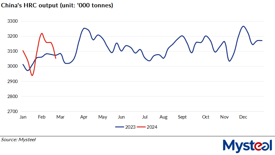 Some steel producers in North China conducted maintenance on their steelmaking facilities during the survey period, resulting in the on-week decline in HRC output, survey respondents noted.