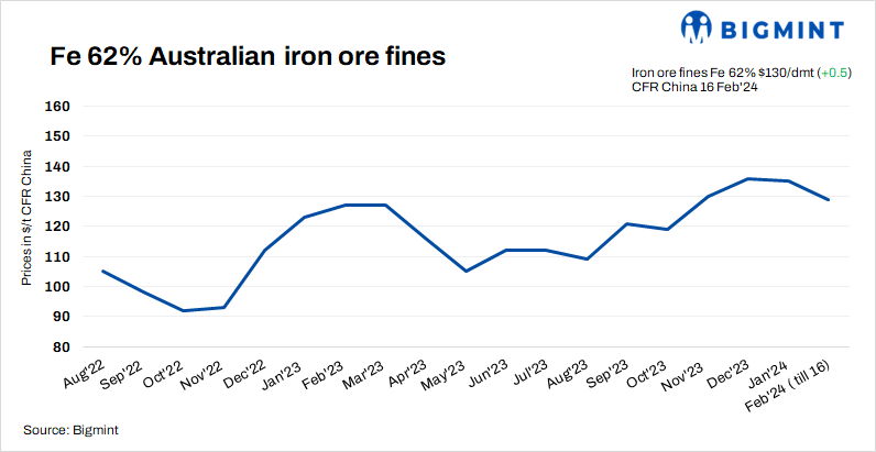 China’s seaborne iron ore prices remained unchanged during the holiday due to limited trading activity during the period, with Mysteel SEADEX 62% Australian Fines index still sitting at $126.6/dmt CFR Qingdao on February 16, unchanged since the last working day before the CNY break.