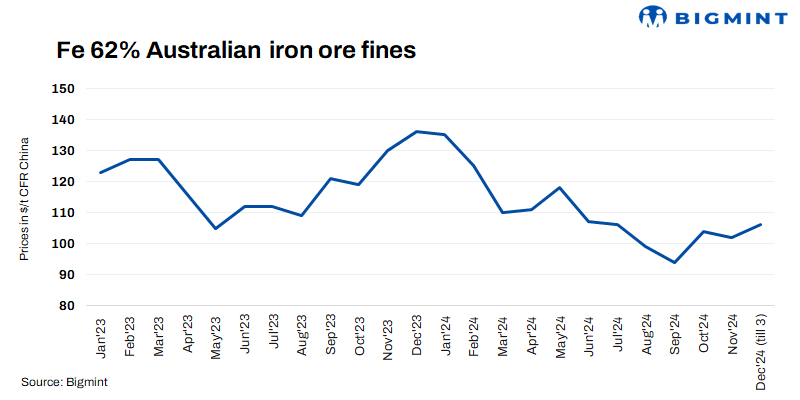Last month, Chinese prices for imported iron ore rose mildly throughout the month, with the Mysteel SEADEX 62% Australian Fines index inching up by $1.7/dmt m-o-m to $103.52/dmt CFR Qingdao by 29 November, for example.