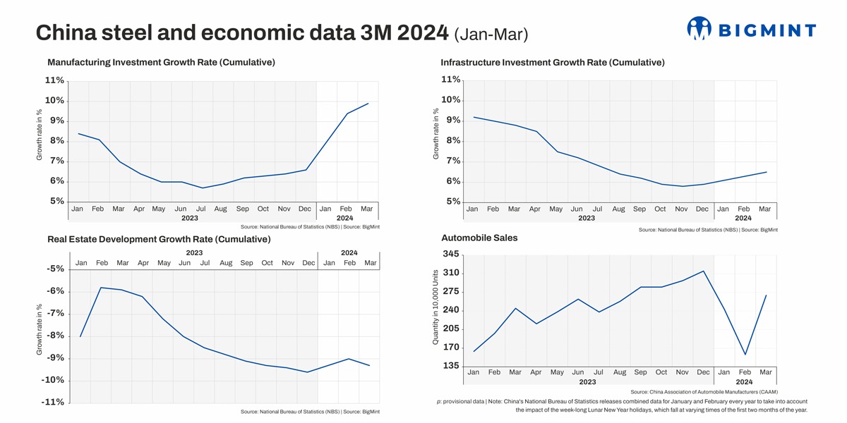 Morning Brief: China’s macro indicators showed a y-o-y improvement in the first quarter (Q1, January-March) of 2024, as per data tracked by BigMint. Performance in key parameters like GDP and industrial production grew y-o-y but realty did poorly.
