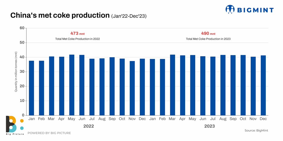 Chinese met coke production increased by over 4% y-o-y to nearly 490 mnt from around 470 mnt in CY’22. As domestic demand in China sagged amid subdued demand from the steel sector, higher volumes were available for exports. Notably, although direct coke exports from China fell y-o-y, indirect exports surged dramatically.