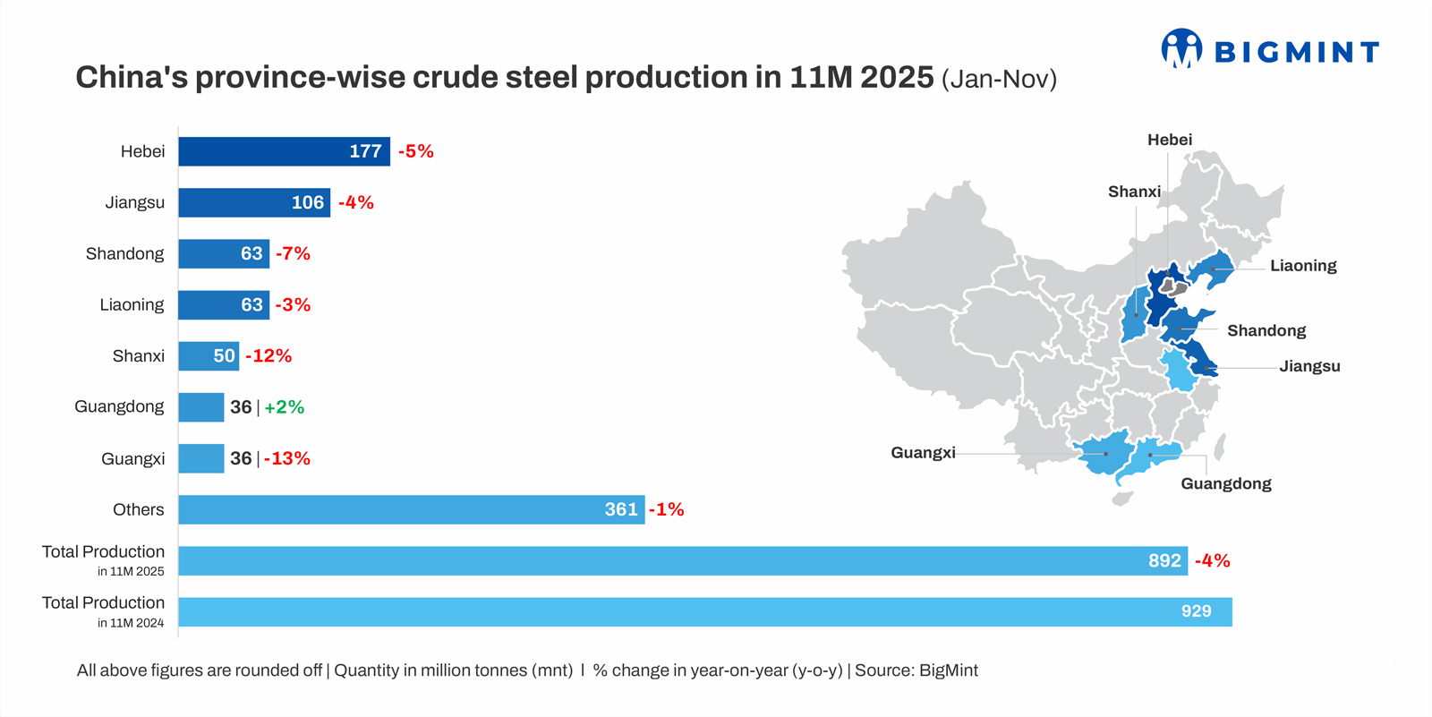 Northern China, especially the Beijing-Tianjin-Hebei belt, has the largest concentration of steel mills in the country and bears the brunt of environmental regulations more than the other steel producing regions. Crude steel production in Hebei dropped 4% y-o-y while Jiangsu in East China, the second-largest steel producing province, saw a decline of 5% in production