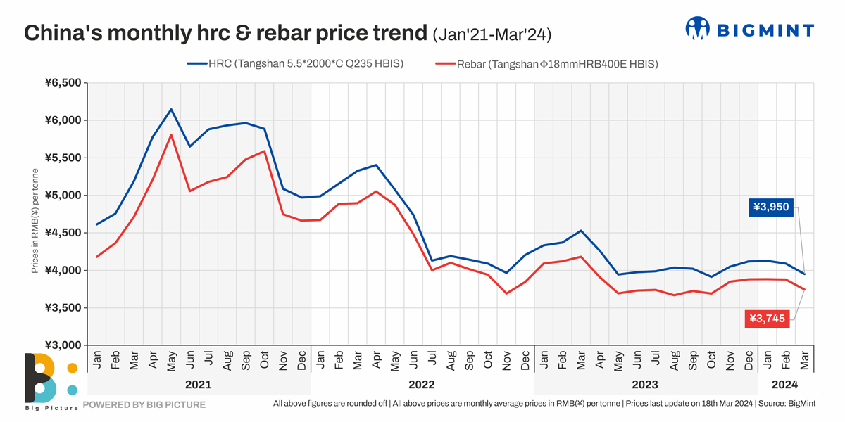 Chinese steel prices declined further on 15 March with bearish sentiment pervading both domestic spot and futures markets, partly dragged by the fragility of country’s property sector that implied sluggish downstream demand for construction steel.