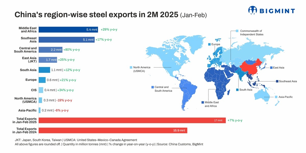 China continued its exports onslaught into the new calendar of 2025 despite several governments across the globe adopting protectionist stances. Steel exports in the first two months of the current calendar (January-February, 2025) totalled 17 million tonnes (mnt), a healthy 7% increase over 15.9 mnt recorded in the same two months in 2024, as per China Customs data, compiled by BigMint.