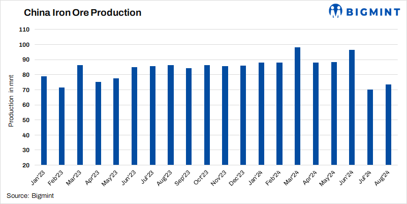 In August alone, China’s ROM iron ore output rebounded by 4.9% m-o-m to reach 73.6 million tonnes, after a steep m-o-m decline of 26.4% in July, according to the NBS data, though the volume was still 16% lower y-o-y.