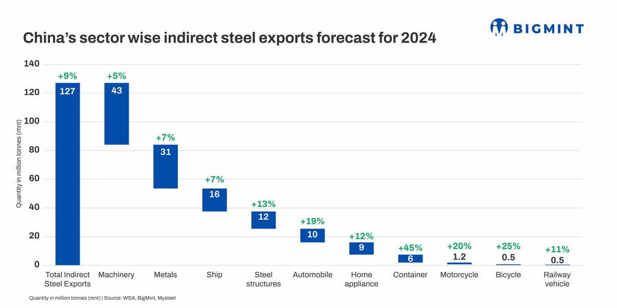 China’s indirect steel exports, which have been showing a healthy growth trend, especially over the last three years, are likely to end calendar 2024 with a 9% increase to around 127 million tonnes (mnt).Data maintained with BigMint reveals, indirect steel exports grew around 3% in 2023 to 116 mnt. Over 50% of China’s exported merchandise comprise machinery, components and other items related to steel.