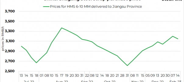 - China’s Shagang Steel has trimmed scrap purchase prices for the first time this month by RMB 50/t ($7/t) for all grades, effective 14 Feb’23.