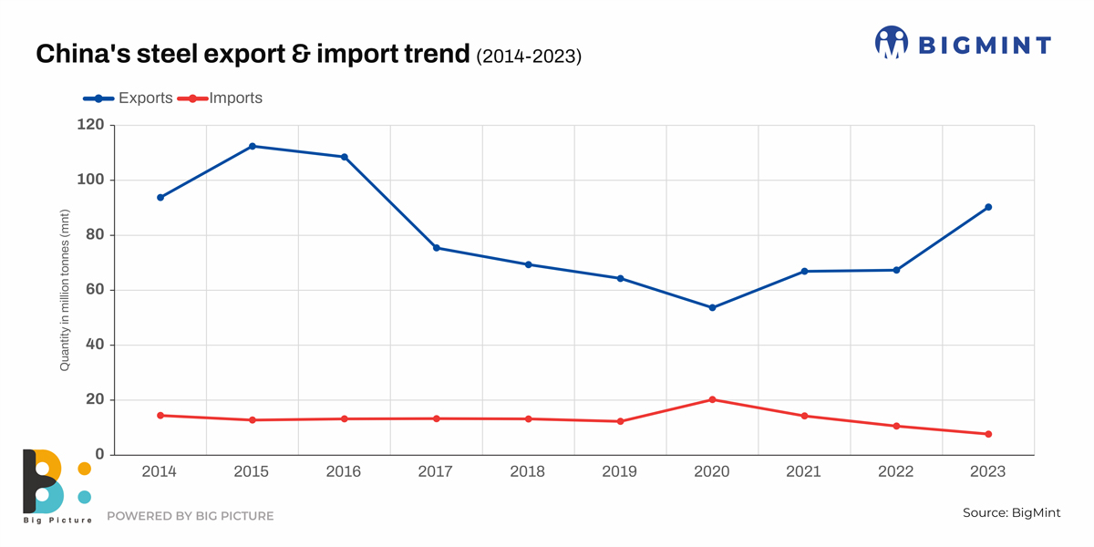The import-export spread widened mainly because Chinese mills, driven by the lack of demand at home, sold overseas aggressively and at highly competitive offers to capture large chunks of the global market. As a result, China’s steel exports touched a six year high of 90 mnt in 2023, a y-o-y rise of 36%, and the highest since 2017. Affected by the reduced demand for domestic construction steel, China’s exports of steel bars, medium-thick and wide steel strips, hot-rolled strips, wire rods, small and medium-sized items and other steel products widely used in the construction industry increased significantly in 2023. In fact, steel bars exports rose 146% y-o-y and medium-thick and wide strips and hot-rolled strips by 97% and 78% respectively.
